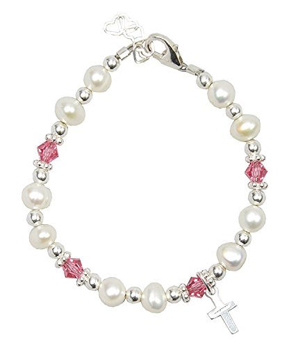 Crystal Dream Christening White Cultured Fresh Water Pearls and Pink Swarovski Crystals with Sterling Silver Cross Luxury Keepsake Child Girl Bracelet (BFWCP_L) [並行輸入品]