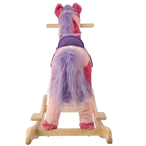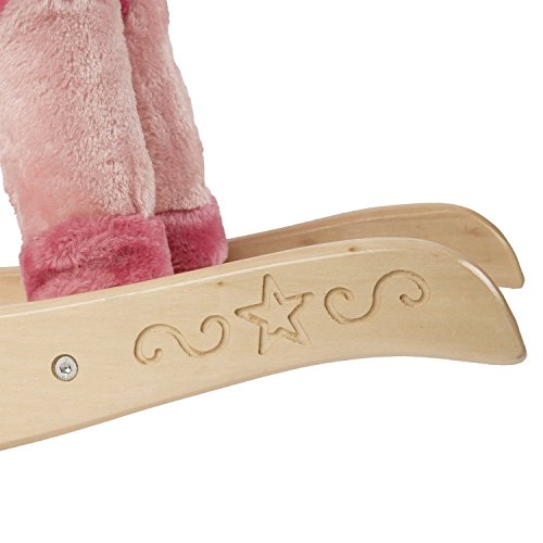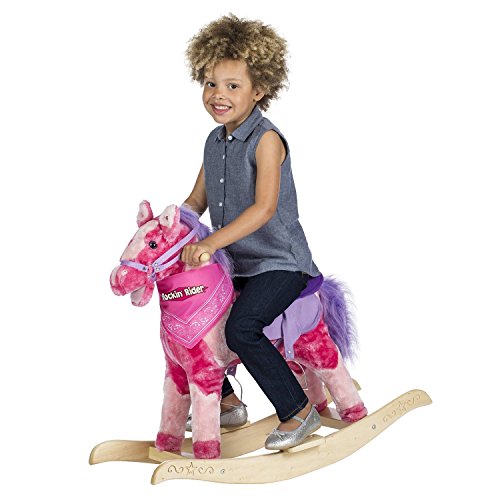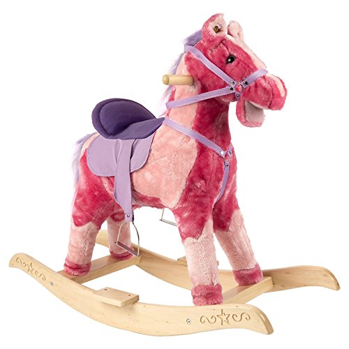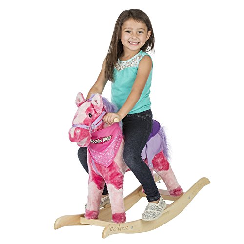 Sierra is a classic rocking horse that features soft two-tone plush over a lightweight and sturdy foam core. She sits on a beautiful wooden base with detailed engraving and a step. With a press of her ears she sings the exclusive 'I'm a Little Pony' song, says 2 fun phrases, and makes realistic horse sounds. Your child will be amazed by Sierra's moving mouth and swishing tail and removable bandana they can wear! Other features include full-body nylon bridle and reins, high-back western style saddle, metal stirrups, wooden handles, colorful eyes, and a realistic mane and tail. Some assembly required. Saddle height is 18 inches. Requires 3 AA batteries included. Sierra is recommended for 3 to 7 years and up to 65 lbs.