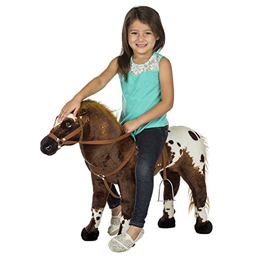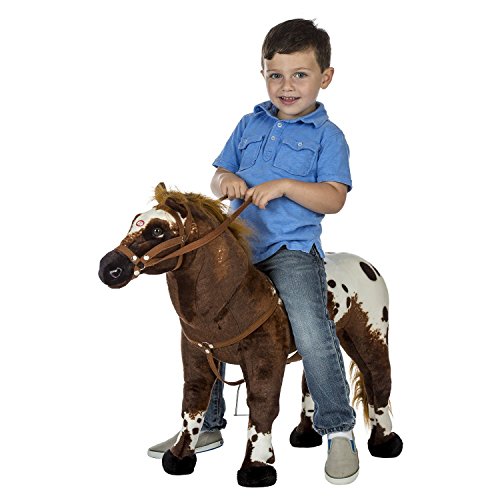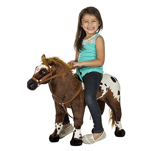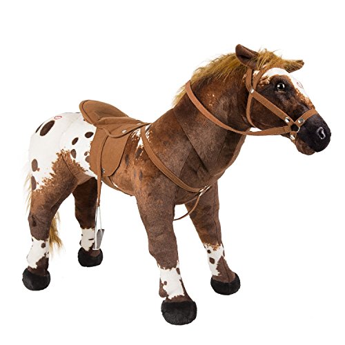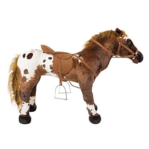 The Rockin' Rider Domino Stable Horse features a realistic horse pattern printed on super soft plush over a tough, sturdy metal frame. With a press of his ears he sings the exclusive 'I'm a Little Pony' song, says 2 fun phrases, and makes realistic horse sounds. Pull on his reins to hear him neigh, pat his snout to hear him snort, and tap his hindquarters to hear galloping and trotting sounds. Domino has an expresive, detailed face, removeable saddle, metal stirrups, and a realistic mane and tail. Saddle height is 18 inches. Requires 2 AA batteries included. Domino is recommended for 3 to 10 years and up to 65 pounds.