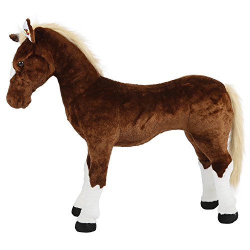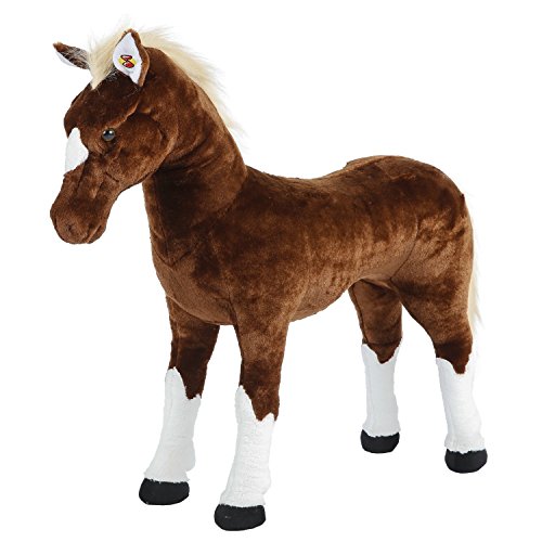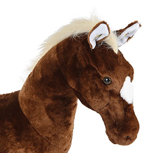 The Rockin' Rider Brown Stable Horse features soft plush over a tough, sturdy metal frame. With a press of his ears he sings the exclusive 'I'm a Little Pony' song, says 2 fun phrases, and makes realistic horse sounds. Other features include an expresive, detailed face and a realistic mane and tail. Saddle height is 18 inches. Requires 2 AA batteries included. Recommended for 3 to 10 years and up to 65 pounds.