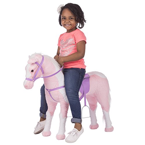 The Rockin' Rider Cookie Stable Horse features soft plush with a painted pattern over a tough, sturdy metal frame. With a press of her ears she sings the exclusive 'I'm a Little Pony' song, says 2 fun phrases, and makes realistic horse sounds. Pull on her reins to hear her neigh, pat her snout to hear her snort, and tap her hindquarters to hear galloping and trotting sounds. Cookie has an expressive, detailed face, removable saddle, metal stirrups, and a realistic mane and tail. Saddle height is 18 inches. Requires 2 AA batteries included. Cookie is recommended for 3 to 10 years and up to 150 pounds.