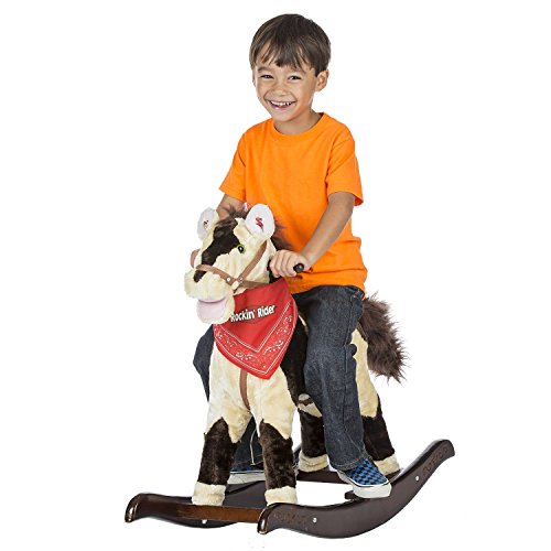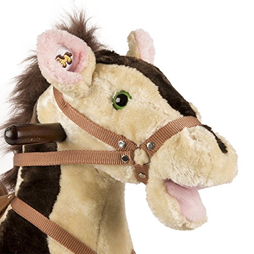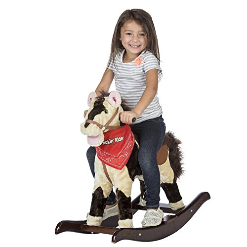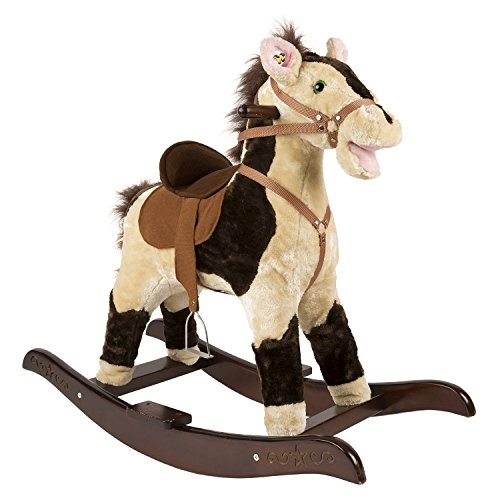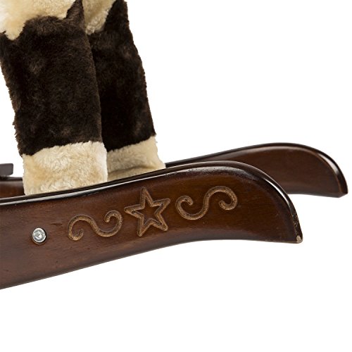 Sheriff is a classic rocking horse that features soft two-tone plush over a lightweight and sturdy foam core. He sits on a beautiful wooden base with detailed engraving and a step. With a press of his ears he sings the exclusive 'I'm a Little Pony' song, says 2 fun phrases, and makes realistic horse sounds. Your child will be amazed by Sheriff's moving mouth and swishing tail and removable bandana they can wear! Other features include full-body nylon bridle and reins, high-back western style saddle, metal stirrups, wooden handles, colorful eyes, and a realistic mane and tail. Some assembly required. Saddle height is 18 inches. Requires 3 AA batteries included. Sheriff is recommended for 3 to 7 years and up to 65 lbs.