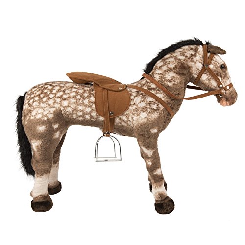 The Rockin' Rider Diesel Stable Horse features a realistic horse pattern printed on super soft plush over a tough, sturdy metal frame. With a press of his ears he sings the exclusive 'I'm a Little Pony' song, says 2 fun phrases, and makes realistic horse sounds. Pull on his reins to hear him neigh, pat his snout to hear him snort, and tap his hindquarters to hear galloping and trotting sounds. Diesel has an expresive, detailed face, removeable saddle, metal stirrups, and a realistic mane and tail. Saddle height is 18 inches. Requires 2 AA batteries included. Diesel is recommended for 3 to 10 years and up to 150 pounds.