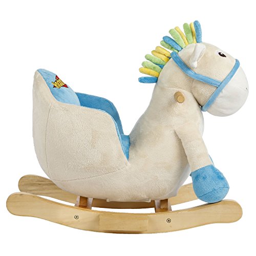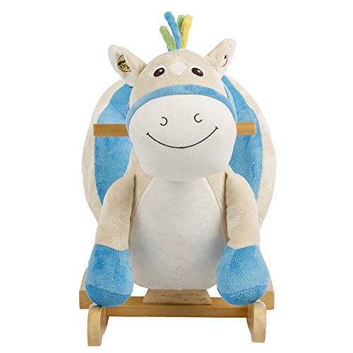 Rockin' Rider Tickles Baby Rocker is a soft stuffed plush horse. It sings the exclusive 'I'm a Little Pony' song when its left ear is squeezed and says 6 fun talking phrases with sound effects when its right ear is squeezed. Your child will love the friendly embroidered horse face. The padded safety seat assists with sitting up and maintaining balance and the safety belt offers added safety. Other features include mane with crinkle material, wooden rocking base with foot steps and wood handles. Some assembly is required. Seat height is 9.5 inches. Requires 2 AA batteries included. Tickles is for ages 9 months to 2 years and holds up to 36 lbs.