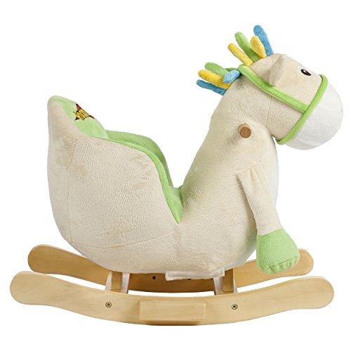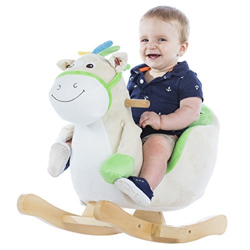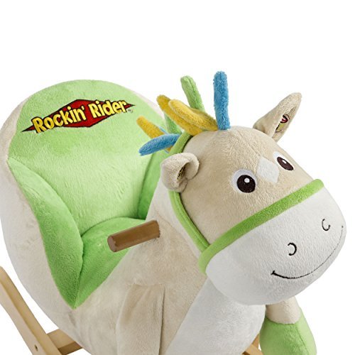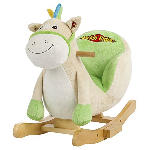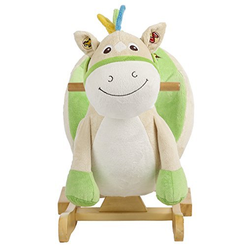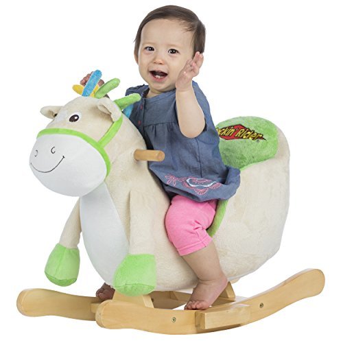 Rockin' Rider Tickles Baby Rocker is a soft stuffed plush horse. It sings the exclusive 'I'm a Little Pony' song when its left ear is squeezed and says 6 fun talking phrases with sound effects when its right ear is squeezed. Your child will love the friendly embroidered horse face. The padded safety seat assists with sitting up and maintaining balance and the safety belt offers added safety. Other features include mane with crinkle material, wooden rocking base with foot steps and wood handles. Some assembly is required. Seat height is 9.5 inches. Requires 2 AA batteries included. Tickles is for ages 9 months to 2 years and holds up to 36 lbs.
