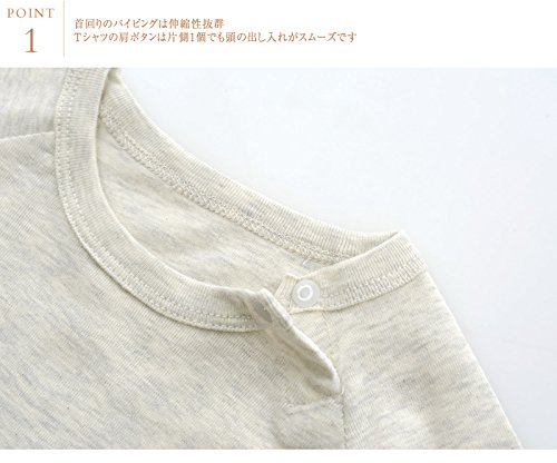 ・首回りのパイピングは伸縮性抜群。Tシャツの肩ボタンは片側1個でも頭の出し入れがスムーズです。