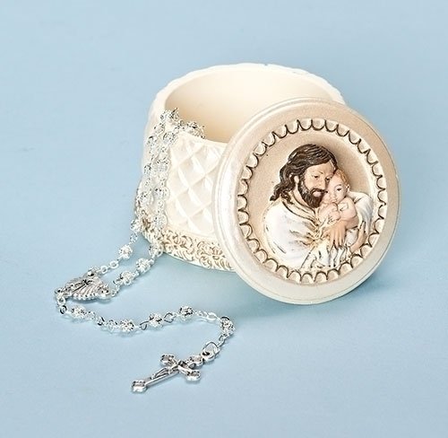 Made of Resin Stone;Approx. Size: 3 x 2 x 3 inches;Rosary not included;Ivory color with gold accents;Lid depicts Jesus holding a baby