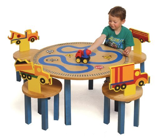 Our Truck activity table set will drive any boy wild. The table top has roads, road signs and train tracks for boys to drive their toy trucks and trains on. The 4 chairs with different Trucks on the chair backs make the adorable play set complete. 36" diameter table, 18" H