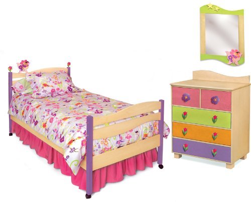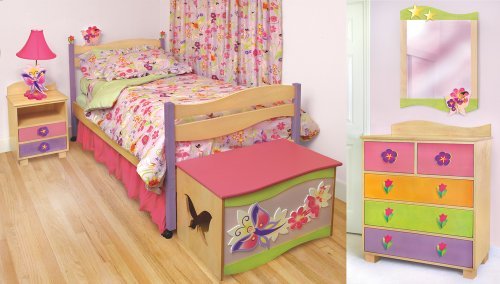 Our Magic Garden 5 piece bedroom set comes complete with twin bed with finials, twin comforter set, twin sheet set, 5 drawer chest and decorative mirror. Made with solid hard wood in a natural finish and accented with colored stains, this quality designer bedroom set has unique features that make it as practical as it is attractive. All chest drawer fronts are reversible and#8211; finished with colored stain on one side and natural finish on the otherand#8212;allowing you to change the look of the chest as your child gets older, extending its use up to teen. Includes set of tulip and purple flower knobs and set of Natural Wave knobs. Includes 3 piece comforter set with a designer print in 100% cotton and includes sham, tailored bed skirt and comforter. Sheets set has solid fitted sheet, flat sheet and pillowcase with print border. Butterfly Fairy lamp, nightstand and window panels sold separately.