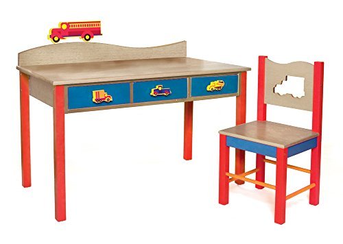 Our child-size Truck desk and chair set has 3 drawersand lots of desktop space. Set is made in solid hardwood finished with grey wash and colored stains. Chair is solid hardwood and chair back has a truck shaped cut-out. Includes 3 Truck knobs and truck finial for wave shaped back piece. Desk is 48"L, 24"D, 28"H. Chair is 16"D x 16"W x 32.5" H. Removable hutch with corkboard back and bookshelf sold separately.