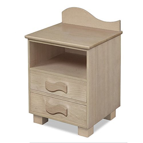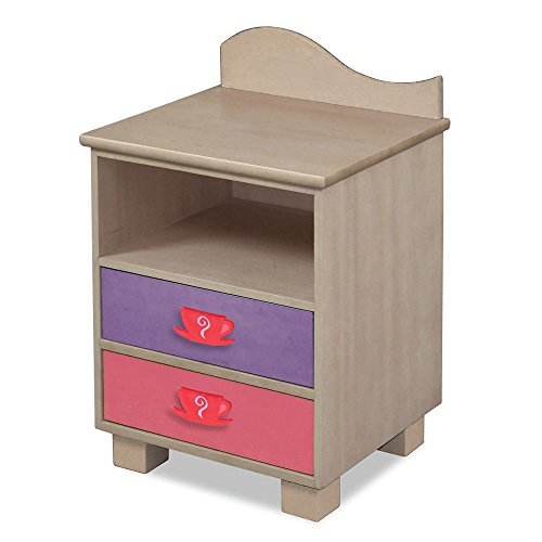 This attractive quality nightstand made of solid hard wood has a wave shaped back piece, and storage shelf for stowing all your children's favorite storybooks and toys. Two drawers have reversible drawer fronts that have a colorful stain finish on one side and grey wash finish on the other, allowing you to easily change the look when your child outgrows the colorful stains. Includes 2 wave knobs and 2 pink teacup knobs. 18"L x 16"D x 29"H
