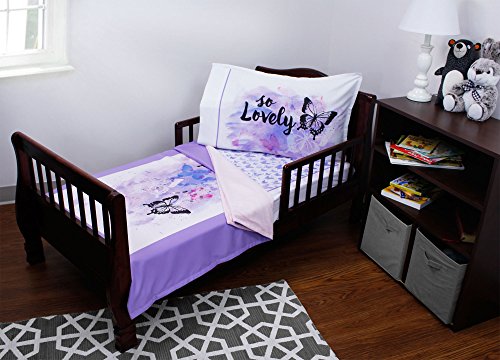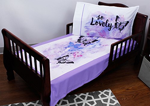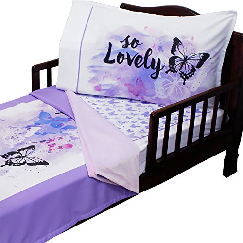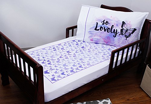 RoomCraft Oh So Lovely toddler size blanket, 36 x 56 inches, fitted sheet, and one standard pillowcase.;Made in the USA. Machine washable.;The sheet and pillowcase are made of 100% microfiber.;The fitted sheet and pillowcase are printed with purple butterflies.;The underside of the blanket is ultra-soft baby minky!