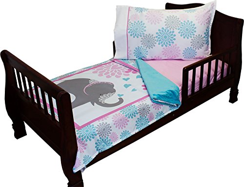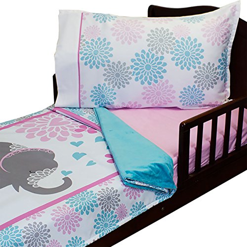 RoomCraft Springtime Elephants toddler size blanket, 36 x 56 inches, fitted sheet, and one standard pillowcase.;Made in the USA. Machine washable.;The pillowcase is printed with an assortment of flowers in different sizes and colors.;The fitted sheet is solid pink and is made of 100% cotton.;The underside of the blanket is ultra-soft baby minky!