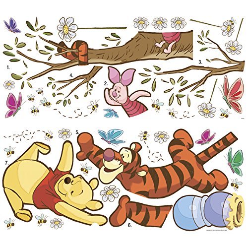 Bring the magic home with these Winnie the Pooh wall decals. Decorate your child's nursery or bedroom with Winnie the Pooh, Tigger, and Piglet swinging for honey. These removable decals are easy to install: simply remove from the backing and assemble on any smooth, flat surface. And each element can be removed, repositioned, and re-applied multiple times without damage or residue on your walls. A great finishing touch for any Pooh & Friends themed bedroom!