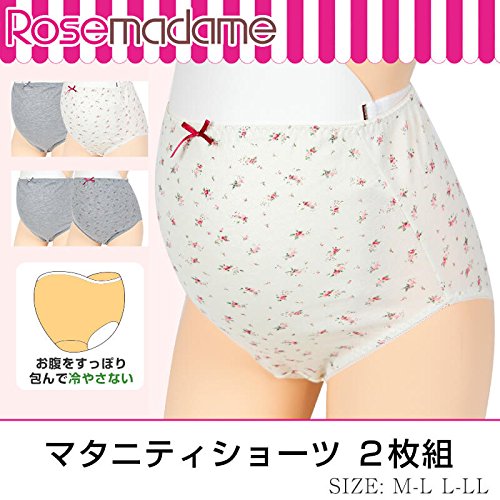 ローズマダム マタニティショーツ 2枚組(M-L・L-LL)肌触りやわらかな花柄マタニティショーツです。お腹をすっぽりと包み込んでくれるゆったりシルエットで子宮を圧迫しません。マチ部分は白布を使用しているので、突然のおしるしにも安心。大きくなるお腹にしっかり対応してくれるので、妊娠初期から臨月まで着用できます。