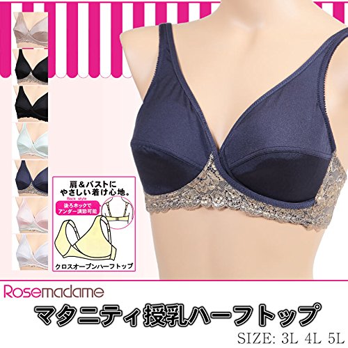 ローズマダム マタニティ授乳ハーフトップ クロスオープンタイプ(3L~5L)シンプルながらレースが施されたオシャレなデザインの授乳兼用ノンワイヤーブラジャーです。すべりの良いストレッチ素材で、ちょっとしたサイズや形の変化にもしっかりと対応してくれますまたバックスタイルが調節可能な豊富な四段階ホックなので、妊娠初期から臨月、そして授乳期までの長い期間体型の変化にしっかりと対応可能です。人気のクロスオープンタイプなのでストレッチ素材のカップ部分をさっとずらすだけで、ラクに授乳できるのもポイント。