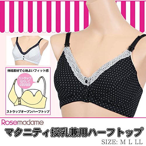 ローズマダム マタニティ授乳兼用ハーフトップ ストラップオープン (M〜L)年間通して使える40フライス。綿100%でデリケートママも安心。産前〜産後まで長く使っていただけるハーフトップ。ワンタッチで外せるストラップオープンタイプだから授乳もらくらく。背中にホックが無いので就寝時にも着用でき、フロントボタンで着心地調整も。取り外し可能なパッドも付いて、妊娠初期から授乳期までと長く使えるマタニティブラです。