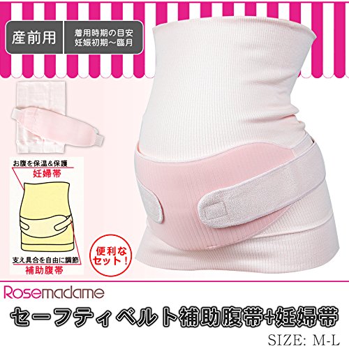 ローズマダム セーフティベルト補助腹帯付き妊婦帯 (M-L)セーフティベルト(補助腹帯)と妊婦帯の便利なセット商品です。取り外しの出来る補助腹帯はお好みの支え具合に調節できます。日中やお腹をしっかり支えたいときは補助腹帯を装着し、リラックスタイムやおやすみの時は腹巻としてとシーンごとの使い分けが可能です。補助腹帯のベルト部分には通し穴があり、ねじれることなく装着できます。安心の日本製です。