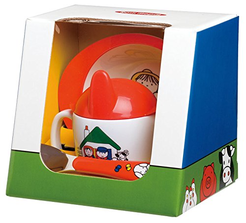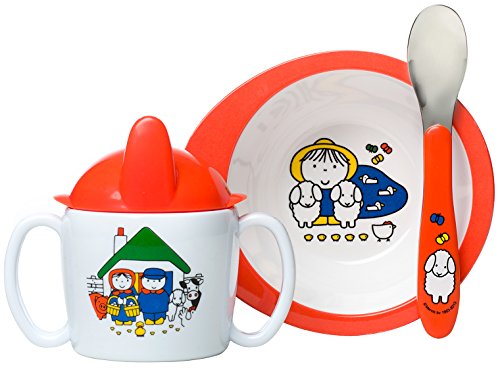 世代を越えて愛され続けるミッフィーでお馴染みのディック・ブルーナのキャラクターたちがプリントされた可愛い食器セット★ボウル、トレイナーマグ、スプーンの3点セット☆絵本からそのまま飛び出してきたような鮮やかな発色は、お子様の目をひき、お食事の時間を楽しくしてくれること間違いなし♪もちろん落としても割れない、食洗機OKのメラミン製だから長く使える、幼児の使い勝手を考え抜いた、実用性の高い安全な構造になっています。器の縁は、お子様でも掴みやすいように設計されています。可愛いギフトボックス入りなので、内祝いやお子様のお誕生日の贈り物、プレゼントにもオススメです♪