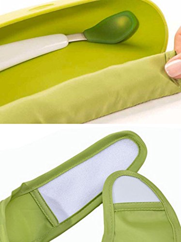 食べこぼしをしっかりキャッチする大きなポケットがついていて、こぼれてもサッと拭いて洗うことができます。