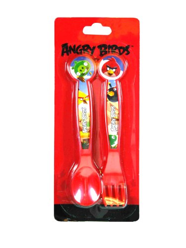 Spoon and Fork Features Angry Birds Characters Red Bird and Green Pig;Set includes (1) Fork and (1) Sppon;Designed for Toddler Self-Feeding;Large Handle area for easy handling;Deeper bowl keeps food on spoon