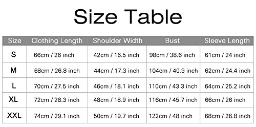 - 買い入れる前に、サイズをご確認ください。 S: 98cm (胸囲);66cm(着丈);61cm(袖丈);42cm(肩幅); M: 104cm (胸囲);68cm(着丈);62cm(袖丈);44cm(肩幅); L: 110cm (胸囲);70cm(着丈);64cm(袖丈);46cm(肩幅); XL: 116cm (胸囲);72cm(着丈);66cm(袖丈);48cm(肩幅); XXL: 122cm (胸囲);74cm(着丈);68cm(袖丈);50cm(肩幅);
