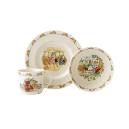 Product Description Generations of children around the world have been weaned with Bunnykins nursery ware as it has been in continuous production since 1934. Styles May Vary. Amazon.com Since its introduction in 1934, Royal Doulton's Bunnykins dinnerware has made mealtimes more delightful for children. Crafted from bone china for beauty and strength, this three-piece children's set is right in keeping with the tradition. Its handsome design, vivid coloration, and superior materials combine to make it an heirloom long after a little one outgrows the diminutive sizing. A beautiful gift, the set also coordinates with an expansive range of Bunnykins accessories. Ideal for toddlers and preschoolers, the set includes an 8-inch plate, a 6-inch cereal bowl, and a 3-inch handled mug. Each piece depicts the playful Bunnykins family at a different activity, but the specific characters and motifs will vary. Weighty and stable, the dishes are sized and shaped for little hands, safe in the dishwasher and microwave, and designed to be chip-resistant. They arrive in a cute gift box and include the Royal Doulton hallmark on the underside of each piece. --Emily Bedard Editor's Note: Specific images and motifs will vary by set.