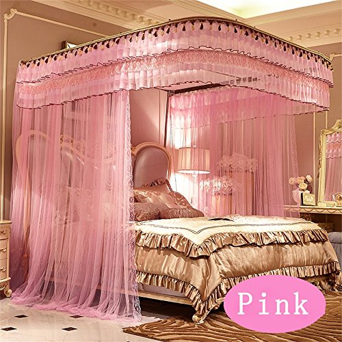 royal- U型手動でレール釣りロッドMosquito Net three-door Singleダブル暗号化Thickeningステンレススチールブラケット 1.5m (5 Feet) Bed ピンク