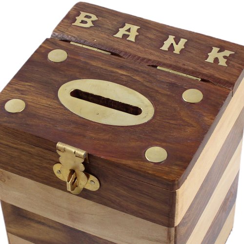 Coin Insert With Lid and Metal Hinge, Convenient Metal Latch To Lock The Money Box., Bank Inlay In Brass On Top Of Box., Height- 5.5 Inches, Diameter- 4 Inches,Weight : 390 Gram, Artisans crafted In India