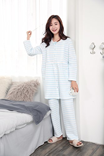 - かわいいストタップ柄、嬉しい長い丈のデザイン、ブルーとピンク2色選べる。ウェスト部分はゴム取替口付き。便利な前開きのルームウェア、授乳機能付き、マタニティにもおすすめ。