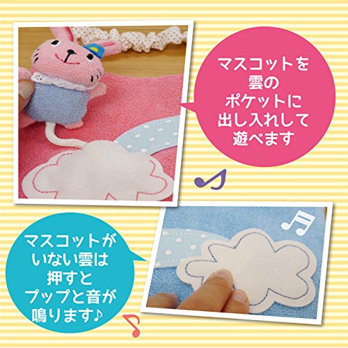 かわいいマスコットを雲のポケットから出したり入れたり、楽しく遊べるタオル地のスタイです。 もう1つの雲には笛が入っていて、押すとプップと音が鳴りますよ サイズ:190x190mm 素材:綿100%(本体)・ポリエステル(アップリケ)