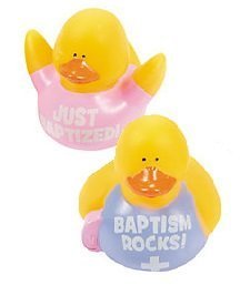 Set of two, 2 inch mini ducks. One duck is "Just Baptized" and the other is holding a rolled up towel "Baptism Rocks!"
