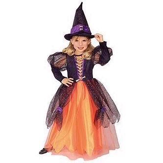 The Prettiest Witch costume includes a beautiful orange dress with purple and gold detail and black sheer overlay. Hemline is pointed. Also includes a matching black and purle hat. Available in three child sizes, small, medium and large. Polyester; hand wash cool.