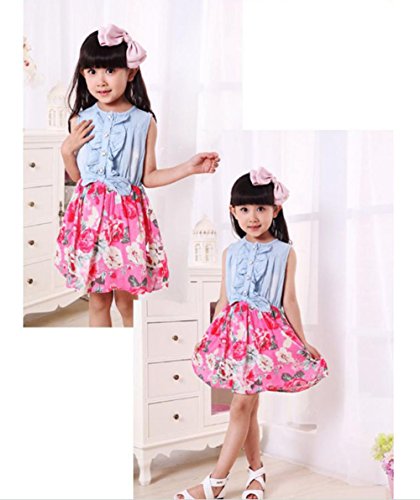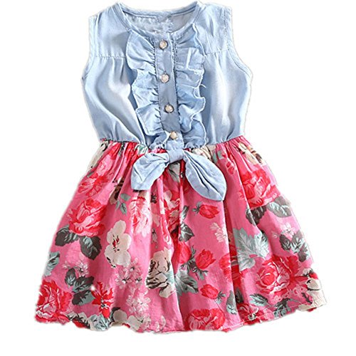 Ruideng 女の子デニム花柄プリントノースリーブワンピーススカート (90cm, レッド)