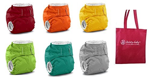 One Size Fits: 6 lbs - 35+ lbs;Stuffable pocket, Unique 6r microfiber soaker with 6 different size and absorbency settings to customize for your baby's needs;Waterproof material made from Biodegradable TPU;Helps save money and the environment;Bonus Dainty Baby Reusable Bag. Image does not represent actual colors that will ship.