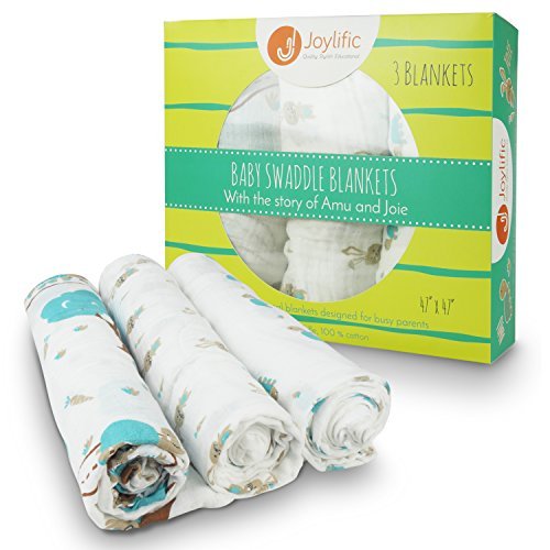 ベビーMuslin Swaddle Blankets – 完璧な教育、ソフトコットン100 % 3パック、おくるみと受信毛布、ベビーシャワーのギフト、with Mini Story " Amu the Turtle and Joie The Rabbit Racing "