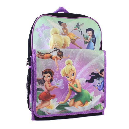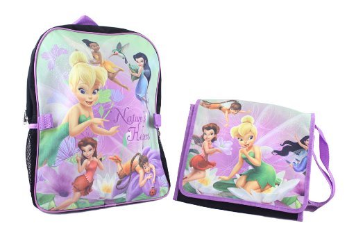 Your fairy princess will love this 15.5 inch Disney Fairies backpack featuring Tinkerbell, Silvermist, Rosetta, Iridessa and Fawn These fairy friends act as "Nature's Helpers" on this stylish black and purple polyester bookbag, which features a spacious main compartment, zippered side pouches and adjustable straps. It also comes with a messenger style lunch bag that features a matching Disney Fairies design. It's a great way to get her excited about going back to school and makes a great travel bag for daycare, trips, sleepovers and more For ages 3 and upDisney Fairies Backpack and Lunch Bag features Tinkerbell, Silvermist, Iridessa, Rosetta and Fawn Bookbag features main compartment, zippered side pouches and adjustable straps Backpack measures 15.5" x 10.5" x 4" Lunch bag measures 9.5" x 10" x 3" 100 percent polyester