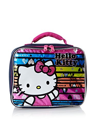 This Sanrio Hello Kitty rectangular insulated lunchbox is a cool and stylish way to make school lunches fun. The Hello Kitty rectangular lunch bag offers children an easy way to tote along their favorite meals and snacks. Lunch box features a black and pink exterior with accents and a fun colorful image of the adorable Hello Kitty! Perfect lunch bag for any Hello Kitty fan!