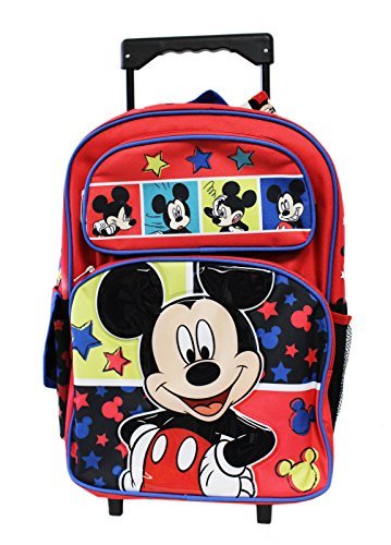 Even Mickey Mouse had to go to school at one time! ; Mickey Mouse rolling backpack; Full size children's backpack; Also can be used as a carry backpack; Includes a mesh and velcro cover side pouch; Measures 16in (40.5cm) tall, 12in (30.5cm) wide and 5in (12.5cm) deep