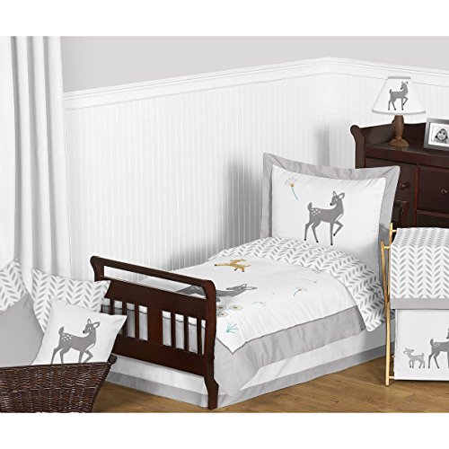 5 PieceフォレストMeadow鹿パターン化リバーシブル布団セット幼児用サイズ、featuring明るいPlayful Deers寝具、ソリッド幾何ボーダーデザイン、Whimsical Wildlife微妙な動物テーマ、アイボリー、グレー