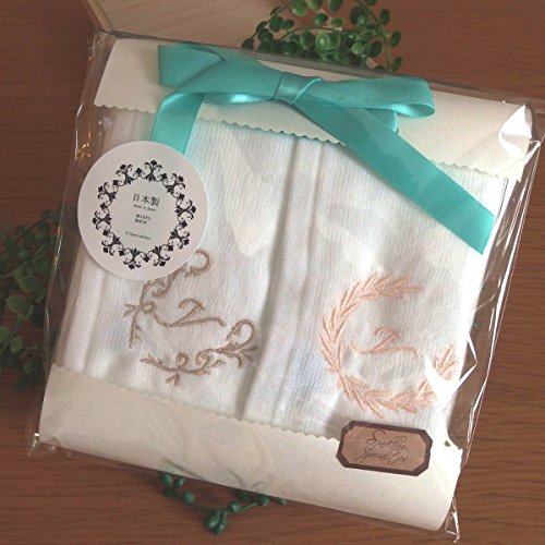 表面がガーゼ、裏面がタオル地のハンドタオル。大判ハンカチとしてもお使いいただけます。純白の生地に、ライトベージュとブラウンの2色のイニシャル刺繍をあしらいセットにしました。ご自身用に、大切な方に、安心と信頼の日本製の商品です。洗うたびに柔らかく、ふんわりボリュームのある大変使いやすい製品です。リボンをあしらった上品なパッケージ。ご自身のパーソナライズドアイテムとして日常使いにも、性別年齢を問わないプチギフト、ご出産お祝いにもどうぞ。