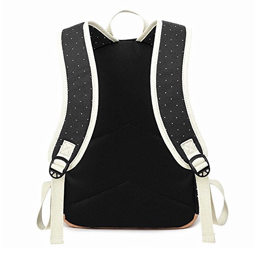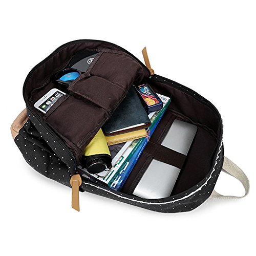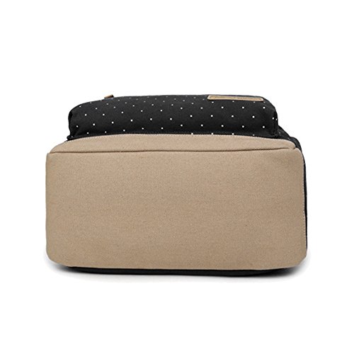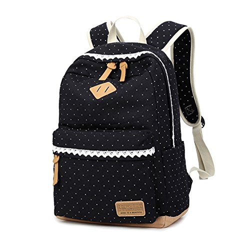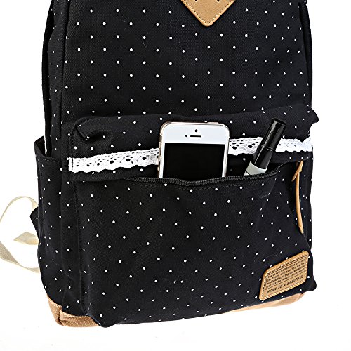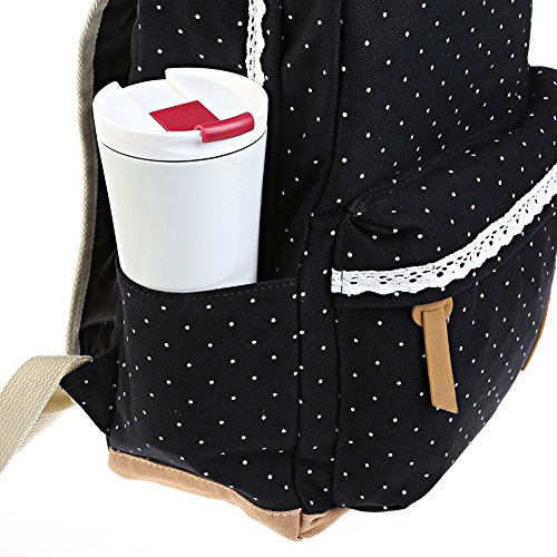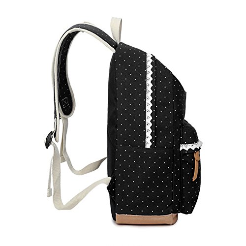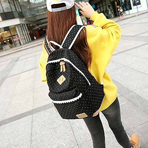 S&D おしゃれなリュックバッグ キャンバス生地 バックパック 学生 女子 社員 通学 通勤 ピクニック 旅行 スポーツ ショッピング レース 圆点 ブラック (42*33*14cm, 圆点 ブラック)