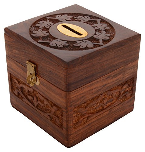 Saaga木製Money Bankコインスロット付き子供/大人のハンドメイド: 4 x 4 x 4インチ(LxBxH )クリスマスプレゼント/ Holiday