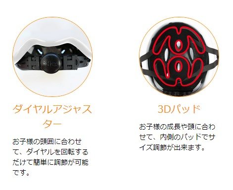 また、ヘルメット内側の3Dパッドでも、お子様の成長にあわせてサイズ調節ができます。 そして、あごひもにバックルを採用したことにより、ワンタッチで簡単にヘルメットの着脱が可能になっています。