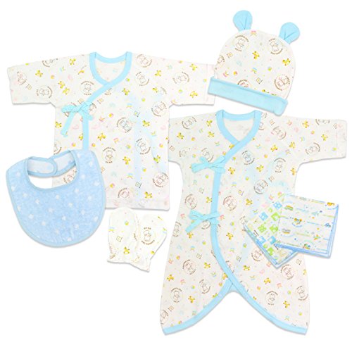 新生児 肌着セット ベビー 赤ちゃん 肌着 7点セット コンビ肌着 短肌着 フライス 帽子 ミトン ガーゼハンカチ スタイ 綿100% 通年 短肌着50-60cm コンビ肌着50-70cm ブルー