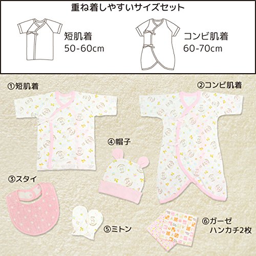 - 短肌着:身丈34cm、身幅24cm、袖丈16cm/コンビ肌着:身丈51cm、身幅26cm、袖丈22cm/帽子:身幅34cm/ハンカチ:29×29cm