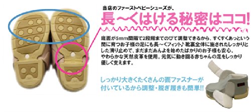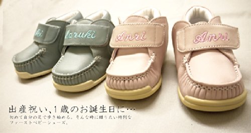 ベルトにお名前が入った上品なデザインのベビーシューズ(ファーストシューズ)。 天然皮革使用で柔らかく、優しくベビーの足を包みながらしっかりと一生懸命に歩く足を支えます 。 全面に施されたしっかりとした滑り止めでまだまだおぼつかないひとり歩きをサポート。 何よりも、一番の特徴である伸びる靴底で 5ミリずつ、3段階のサイズ調整が出来るのですくすく育つあかちゃんもなが~く履く事が可能です。 やわらかく優しいパステルカラーと無地のシンプルで上品なデザインは普段使いも、おめかしにもピッタリ。 初めてのひとり歩きに特別なファーストベビーシューズを。 大人になって手に取った時も喜んで欲しいから、一針一針丹念に縫製し、心をこめてお名前を刺繍しています。 出産祝いや、1歳の誕生日に喜ばれる特別なベビーシューズです。 ※ご注文の前には必ずご確認ください! ◆こちらの商品はお名前をアルファベットにて刺繍させていただきます。 ご注文の際は必ず、お子様のお名前(アルファベット表記にて) 一文字目は大文字、以下は小文字になります。メールにてお知らせ下さい。 □表記例→ Yuki・Sintarou 等 ◆こちらの商品はご注文を頂いてからお届けまで 約1ヶ月間の期間を要します。 ◆ご注文を頂いてから、名入れ等の製作にとりかかります。 ご注文後のキャンセルはお受けできませんのでご確認ください 天然皮革使用で柔らかいベビーシューズ、名入れが出来る赤ちゃん用の靴 サイズが伸びる ネーミング ベビーシューズ ファーストシューズ 靴 【S・Mサイズ】
