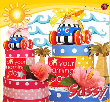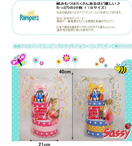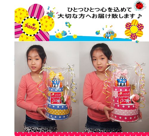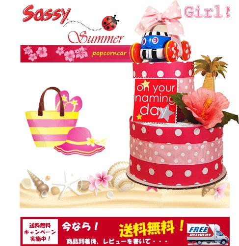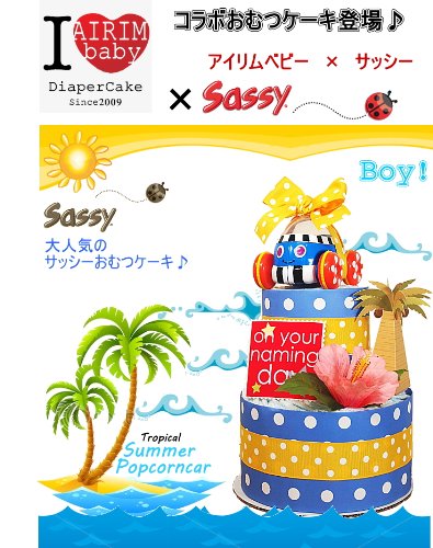 大人気サッシーおむつケーキ「サマーポップコーンカー」こんな出産祝い見たことないと絶賛♪真夏のハワイをイメージしたおむつケーキ!ハワイ好き&海好き&サーファーのお友達の出産祝いにオススメのオムツケーキです。 紙おむつは産婦人科推奨のパンパース25枚!! ずっと飾っておきたい出産祝いギフトナンバー1。 ワンランク上のおむつケーキ新登場! ポイントはSassyのポップカーンカーのおもちゃ♪ 赤ちゃんの手にもしっかりと持てる、ころりんカーに仲間が増えました。 車を後ろに引いたまま手を放すと、すい〜っと走り出します。 車の屋根の透明ドームの中でカラフル・ビーズがポコポコ跳ねて踊っています。 何度でも飽きずにたのしむことができる楽しさと耐久性をもっています。 何度でも動かして楽しむうちに、赤ちゃんの車を追い掛けたいという気持ちが、お座りからはいはいや立ち上がったり一人歩きすることを促します。 赤ちゃんにとって実用的なアイテムが全てそろった出産祝いとなっております。