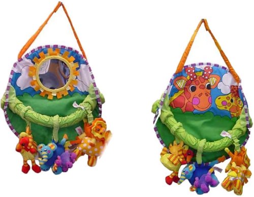 裏表どちらにも取り付け可能なおもちゃバーには、それぞれ単体でも遊べるダチョウ・ゾウ・ライオンの「親子ペア・ラトル」付き! 車のヘッドレストやベビーキャリー、ベビーカーに取り付けてあげて。