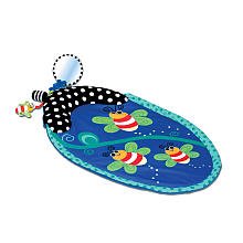 Sassy Tummy Time Mat - comes with a true reflection mirror that helps baby engage because babies love to look a human faces. Also features a built-in tummy time bolster to support baby and help develop torso muscles. The high contrast bell provides visual and auditory stimulation while the soft plastic firefly encourages mouthing exploration. Lastly, the butterfly engages touch.